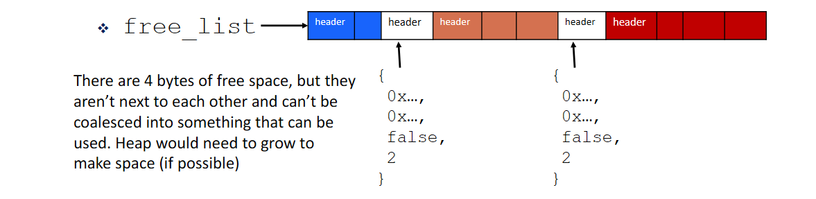 However, free lists often end up with external fragmentation that can’t be combined together anymore.